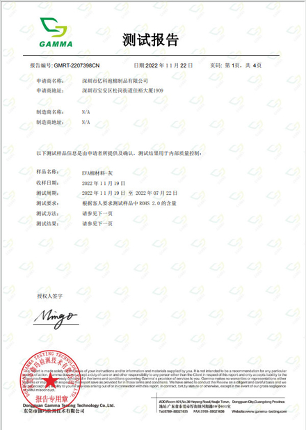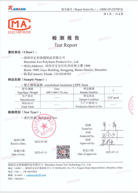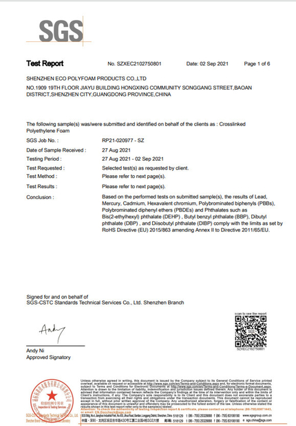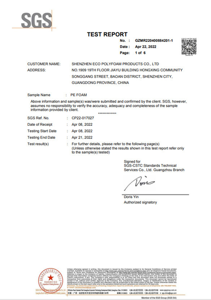 Estándar: PE Foam RoHSNúmero:Fecha de emisión:Fecha de caducidad: