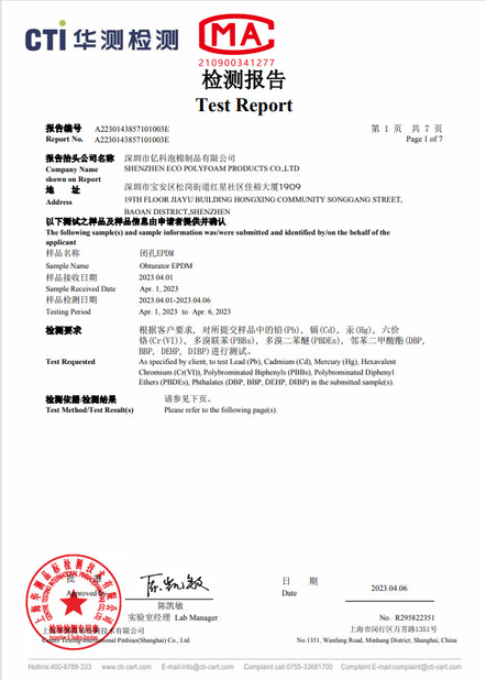 Estándar: EPDM Rubber Foam RoHSNúmero:Fecha de emisión:Fecha de caducidad: